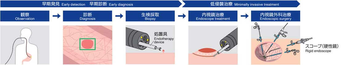 その後内視鏡は飛躍的な進化を遂げ医療の現場に広く普及、体に挿入して内部の様子を見ることができるだけでなく、ガンなど疾患の『早期発見』、『早期診断』、『低侵襲治療』を可能にし、患者さんのQOL(Quality of Life:生活の質)向上に貢献しています。内視鏡は、胃や大腸などの消化管のほか、気管支、泌尿器、脳、関節など、さまざまな部位で活躍しています。